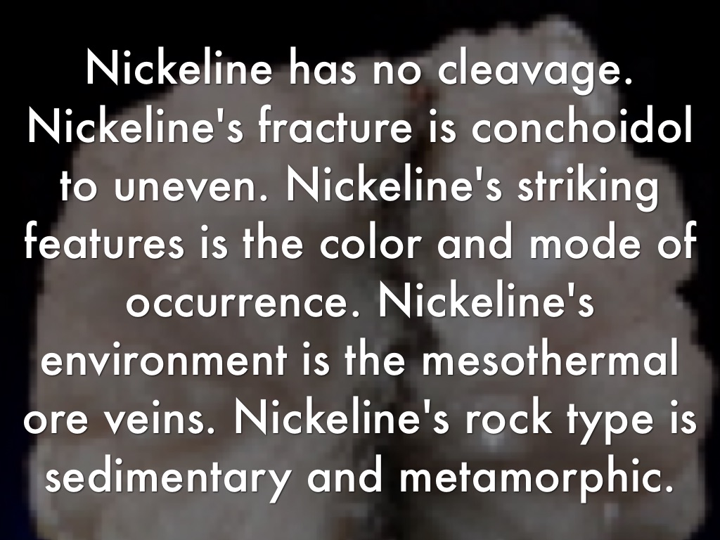 Nickeline has no cleavage. Nickeline's fracture is conchoidol to uneven. Nickeline's striking features is the color and mode of occurrence. Nickeline's environment is the mesothermal ore veins. Nickeline's rock type is sedimentary and metamorphic.