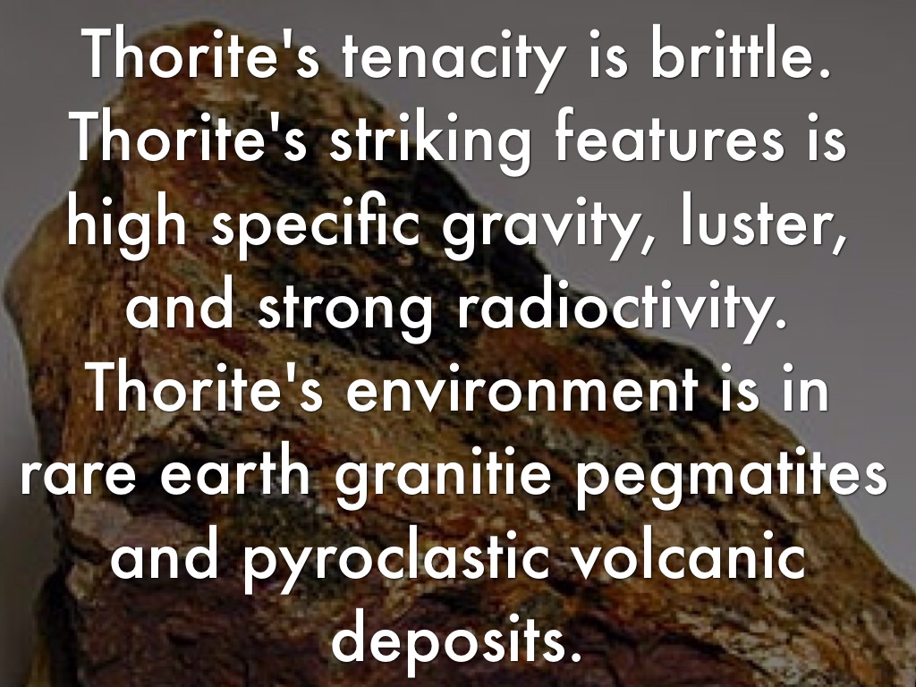 Thorite's tenacity is brittle. Thorite's striking features is high specific gravity, luster, and strong radioctivity. Thorite's environment is in rare earth granitie pegmatites and pyroclastic volcanic deposits.