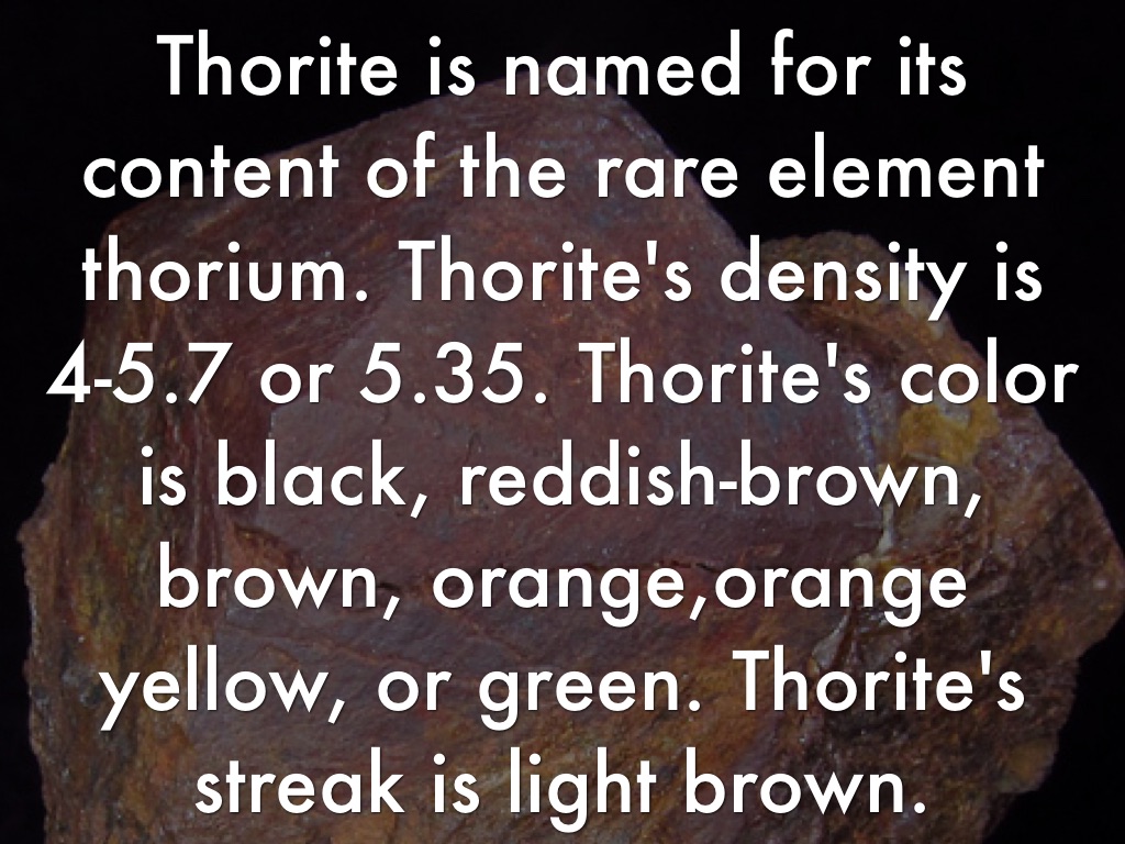 Thorite is named for its content of the rare element thorium. Thorite's density is 4-5.7 or 5.35. Thorite's color is black, reddish-brown, brown, orange,orange yellow, or green. Thorite's streak is light brown.