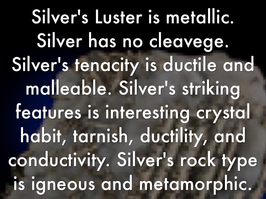 Silver's Luster is metallic. Silver has no cleavege. Silver's tenacity is ductile and malleable. Silver's striking features is interesting crystal habit, tarnish, ductility, and conductivity. Silver's rock type is igneous and metamorphic.