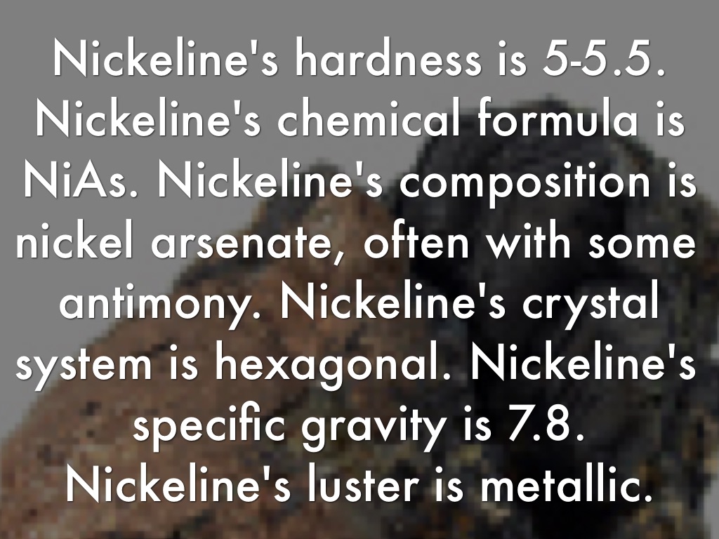 Nickeline's hardness is 5-5.5. Nickeline's chemical formula is NiAs. Nickeline's composition is nickel arsenate, often with some antimony. Nickeline's crystal system is hexagonal. Nickeline's specific gravity is 7.8. Nickeline's luster is metallic.