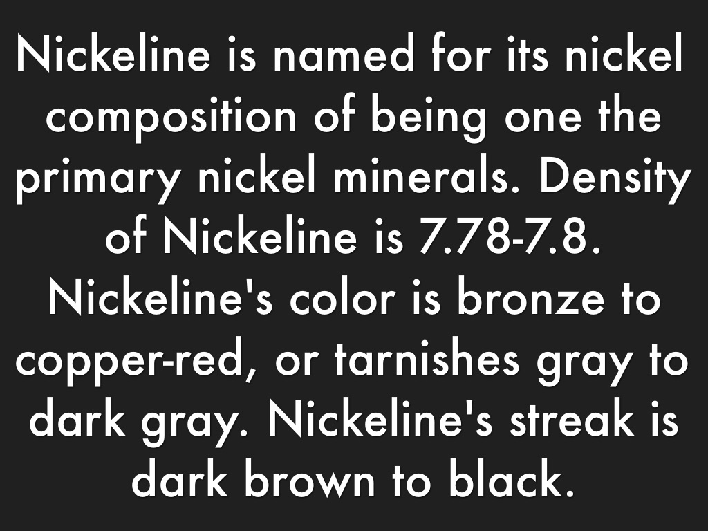 Nickeline is named for its nickel composition of being one the primary nickel minerals. Density of Nickeline is 7.78-7.8. Nickeline's color is bronze to copper-red, or tarnishes gray to dark gray. Nickeline's streak is dark brown to black.