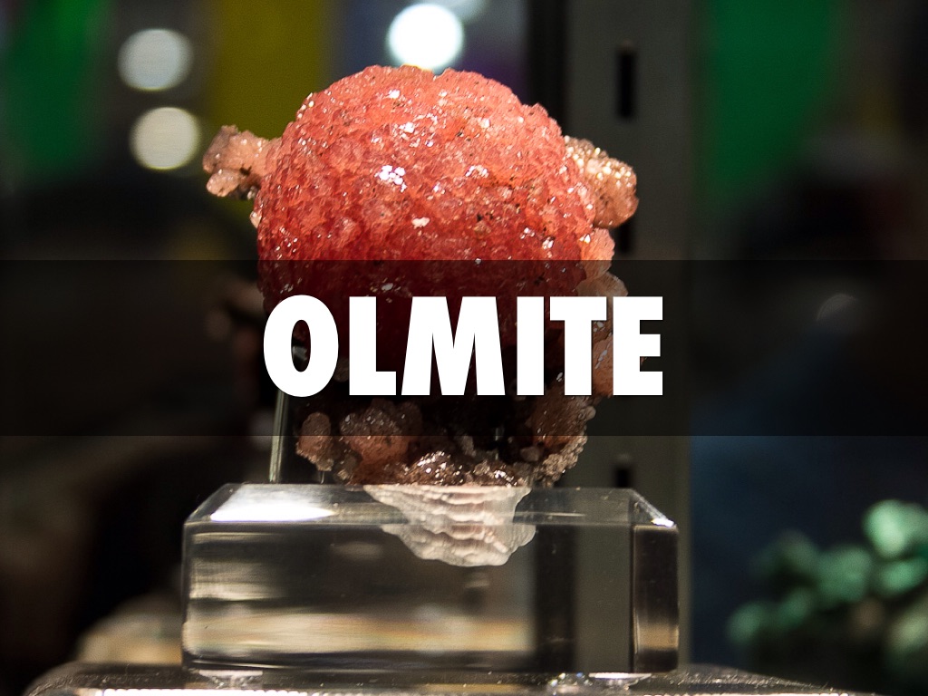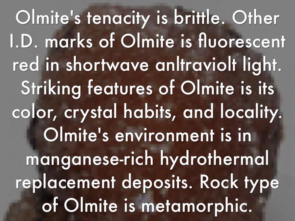 Olmite's tenacity is brittle. Other I.D. marks of Olmite is fluorescent red in shortwave anltraviolt light. Striking features of Olmite is its color, crystal habits, and locality. Olmite's environment is in manganese-rich hydrothermal replacement deposits. Rock type of Olmite is metamorphic.