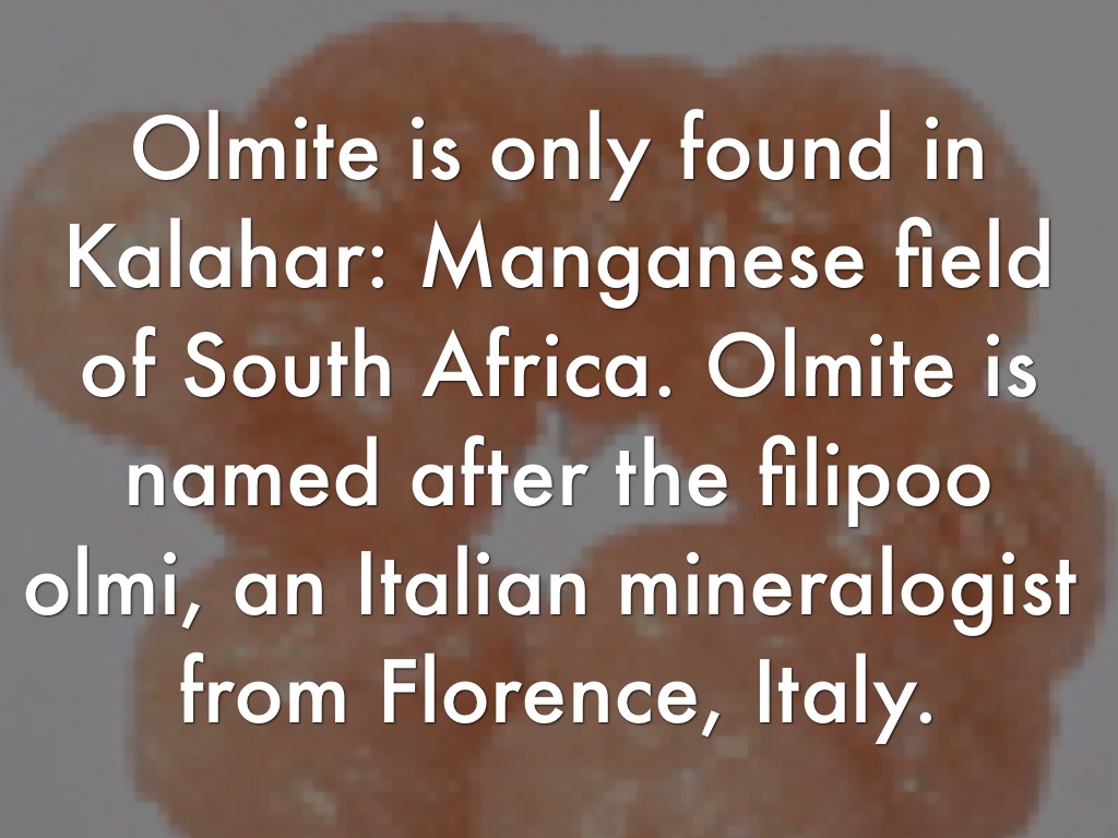 Olmite is only found in Kalahar: Manganese field of South Africa. Olmite is named after the filipoo olmi, an Italian mineralogist from Florence, Italy.
