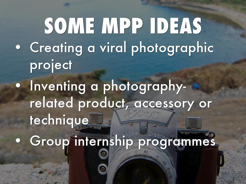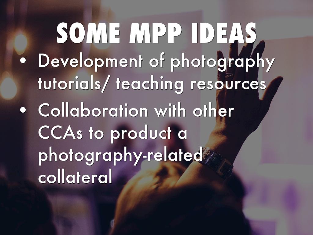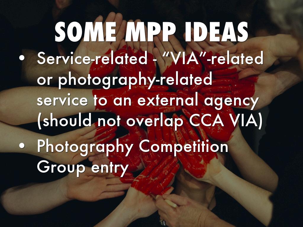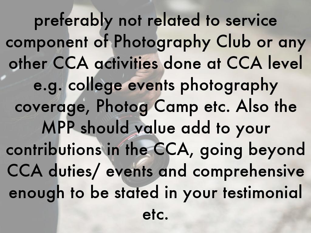 preferably not related to service component of Photography Club or any other CCA activities done at CCA level e.g. college events photography coverage, Photog Camp etc. Also the MPP should value add to your contributions in the CCA, going beyond CCA duties/ events and comprehensive enough to be stated in your testimonial etc.