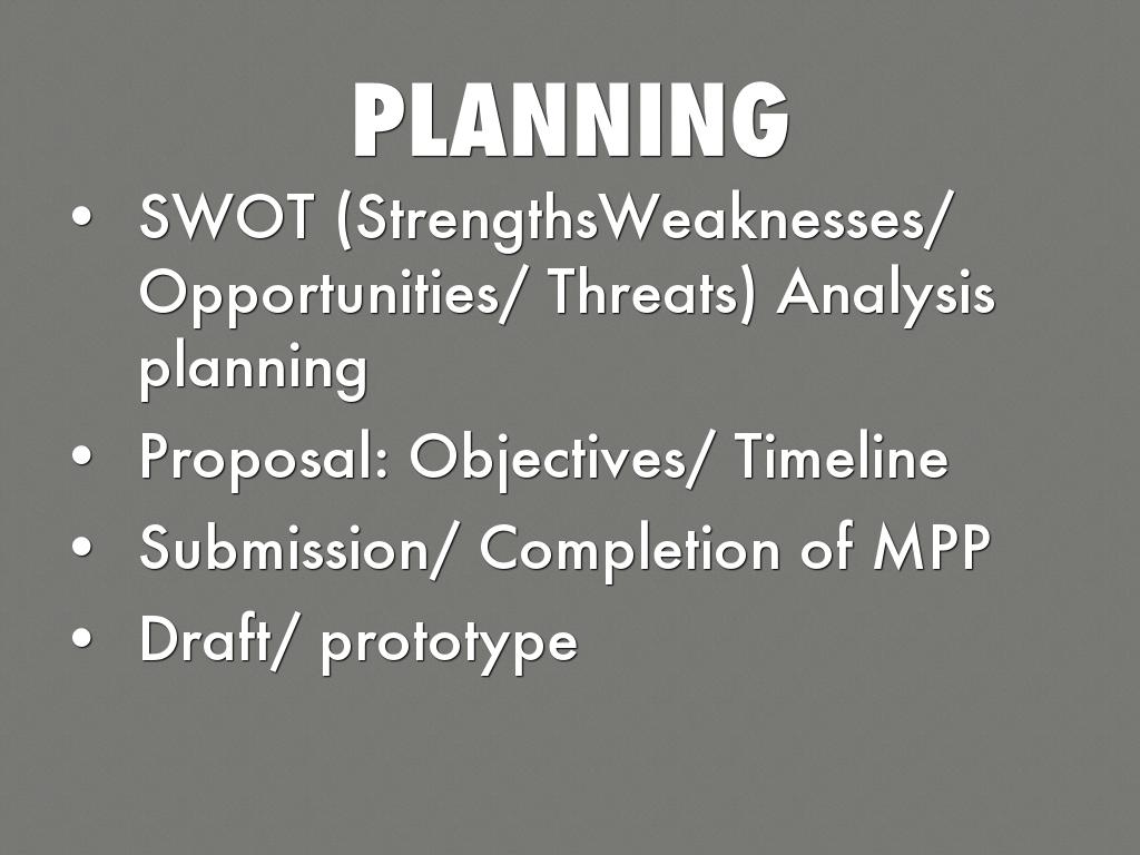• SWOT (StrengthsWeaknesses/ Opportunities/ Threats) Analysis planning