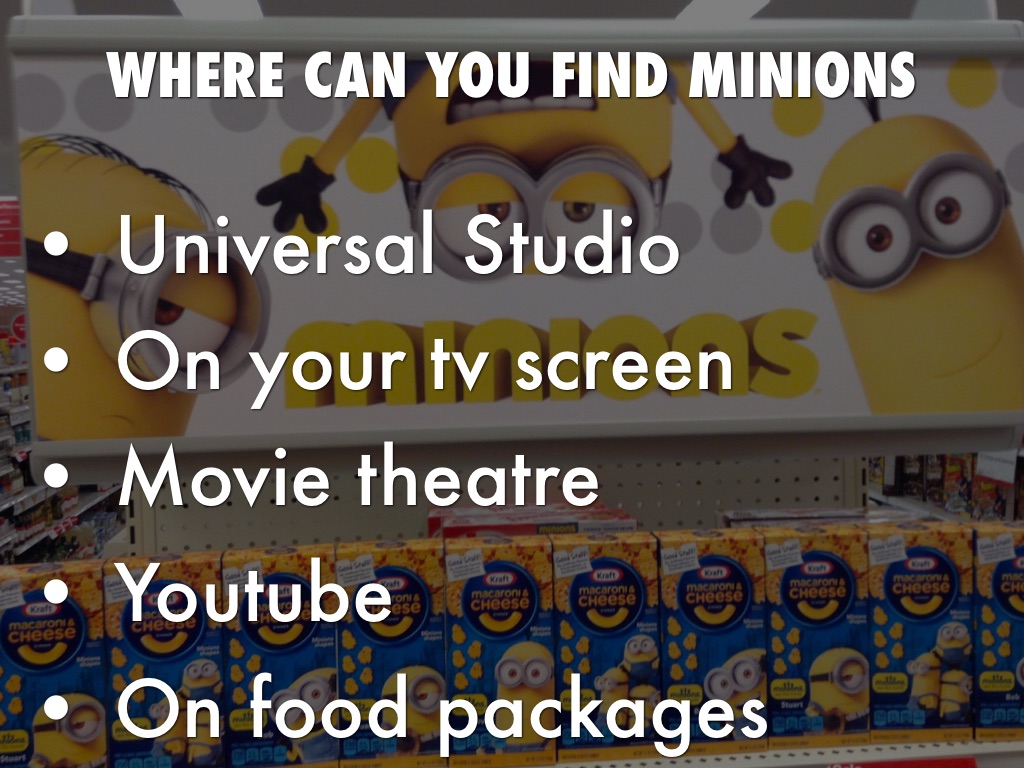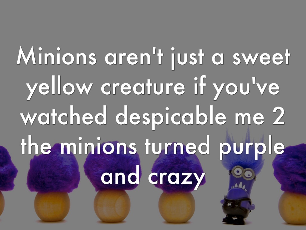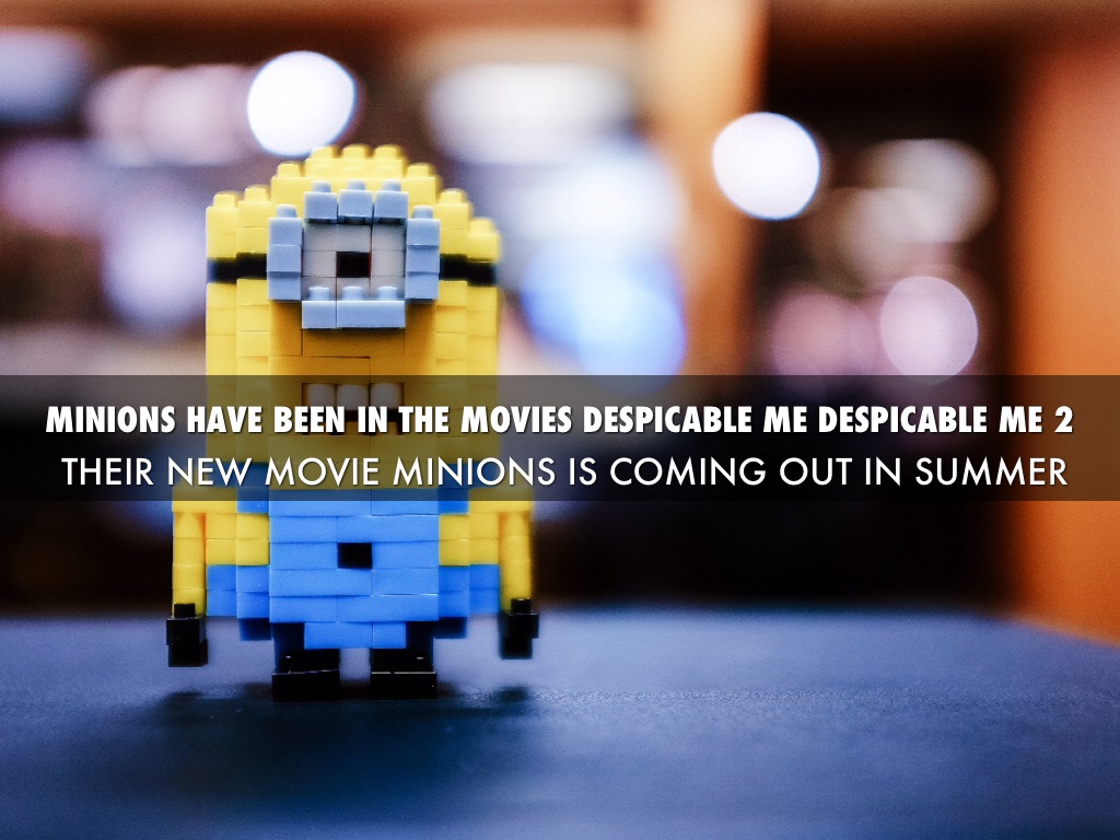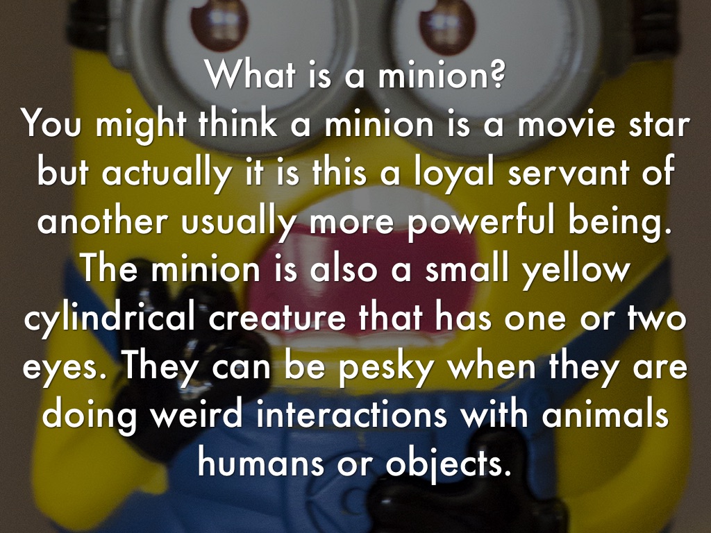 What is a minion? You might think a minion is a movie star but actually it is this a loyal servant of another usually more powerful being. The minion is also a small yellow cylindrical creature that has one or two eyes. They can be pesky when they are doing weird interactions with animals humans or objects.