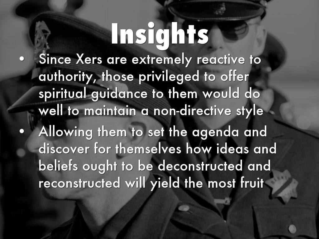 Since Xers are extremely reactive to authority, those privileged to offer spiritual guidance to them would do well to maintain a non-directive style