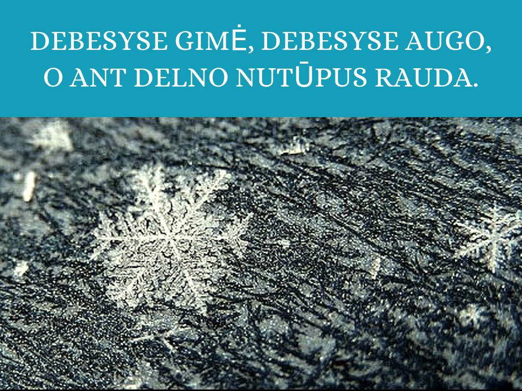 DEBESYSE GIMĖ, DEBESYSE AUGO, O ANT DELNO NUTŪPUS RAUDA.