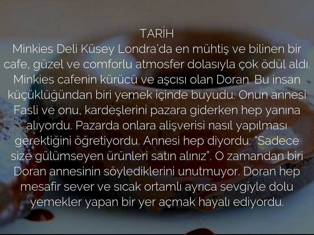 Minkies Deli Küsey Londra’da en mühtiş ve bilinen bir cafe, güzel ve comforlu atmosfer dolasıyla çok ödül aldı. Minkies cafenin kürücü ve aşcısı olan Doran. Bu insan küçüklüğündan biri yemek içinde buyudu. Onun annesi Fasli ve onu, kardeşlerini pazara giderken hep yanına alıyordu. Pazarda onlara alişverisi nasıl yapılması gerektiğini öğretiyordu. Annesi hep diyordu: “Sadece size gülümseyen ürünleri satın alınız”. O zamandan biri Doran annesinin söylediklerini unutmuyor. Doran hep mesafir sever ve sıcak ortamlı ayrıca sevgiyle dolu yemekler yapan bir yer açmak hayalı ediyordu.