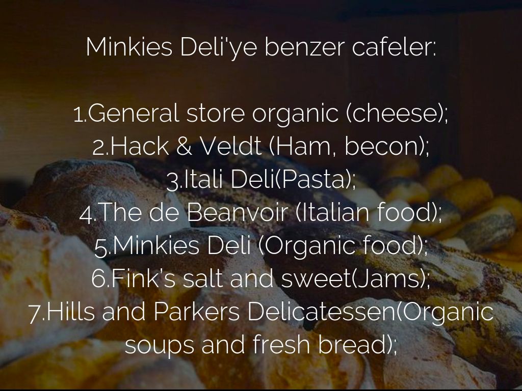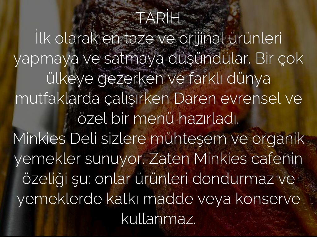 Minkies Deli sizlere mühteşem ve organik yemekler sunuyor. Zaten Minkies cafenin özeliği şu: onlar ürünleri dondurmaz ve yemeklerde katkı madde veya konserve kullanmaz.
