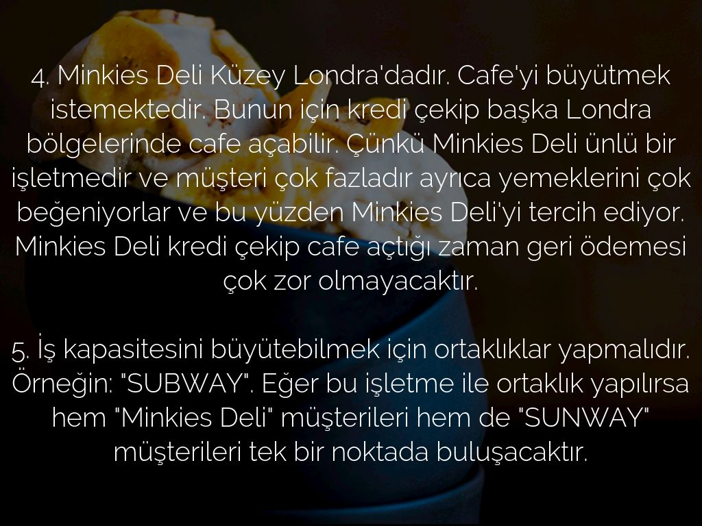 4. Minkies Deli Küzey Londra'dadır. Cafe'yi büyütmek istemektedir. Bunun için kredi çekip başka Londra bölgelerinde cafe açabilir. Çünkü Minkies Deli ünlü bir işletmedir ve müşteri çok fazladır ayrıca yemeklerini çok beğeniyorlar ve bu yüzden Minkies Deli'yi tercih ediyor. Minkies Deli kredi çekip cafe açtığı zaman geri ödemesi çok zor olmayacaktır.