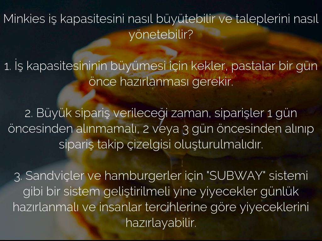 5. İş kapasitesini büyütebilmek için ortaklıklar yapmalıdır. Örneğin: "SUBWAY". Eğer bu işletme ile ortaklık yapılırsa hem "Minkies Deli" müşterileri hem de "SUNWAY" müşterileri tek bir noktada buluşacaktır.