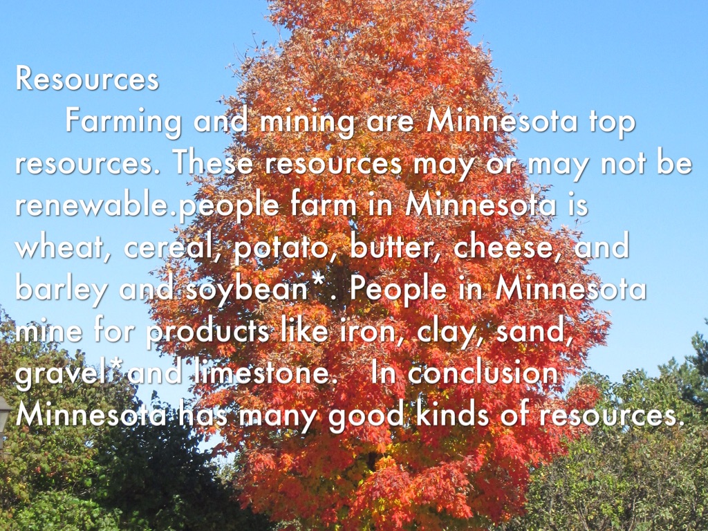 Resources Farming and mining are Minnesota top resources. These resources may or may not be renewable.people farm in Minnesota is wheat, cereal, potato, butter, cheese, and barley and soybean*. People in Minnesota mine for products like iron, clay, sand, gravel*and limestone. In conclusion Minnesota has many good kinds of resources.