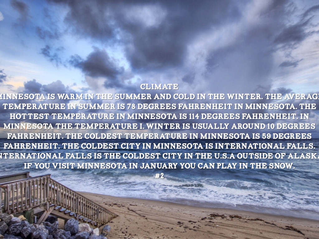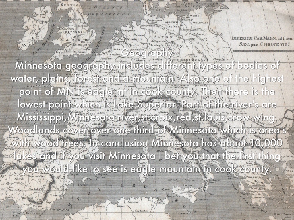 Minnesota geography includes different types of bodies of water, plains, forest and a mountain. Also one of the highest point of MN is eagle mt in cook county. Then there is the lowest point which is Lake Superior. Part of the river's are Mississippi,Minnesota river,st.croix,red,st.louis,crow wing. Woodlands cover over one third of Minnesota which is area's with wood trees. In conclusion Minnesota has about 10,000 lakes and if you visit Minnesota I bet you that the first thing you would like to see is eagle mountain in cook county.