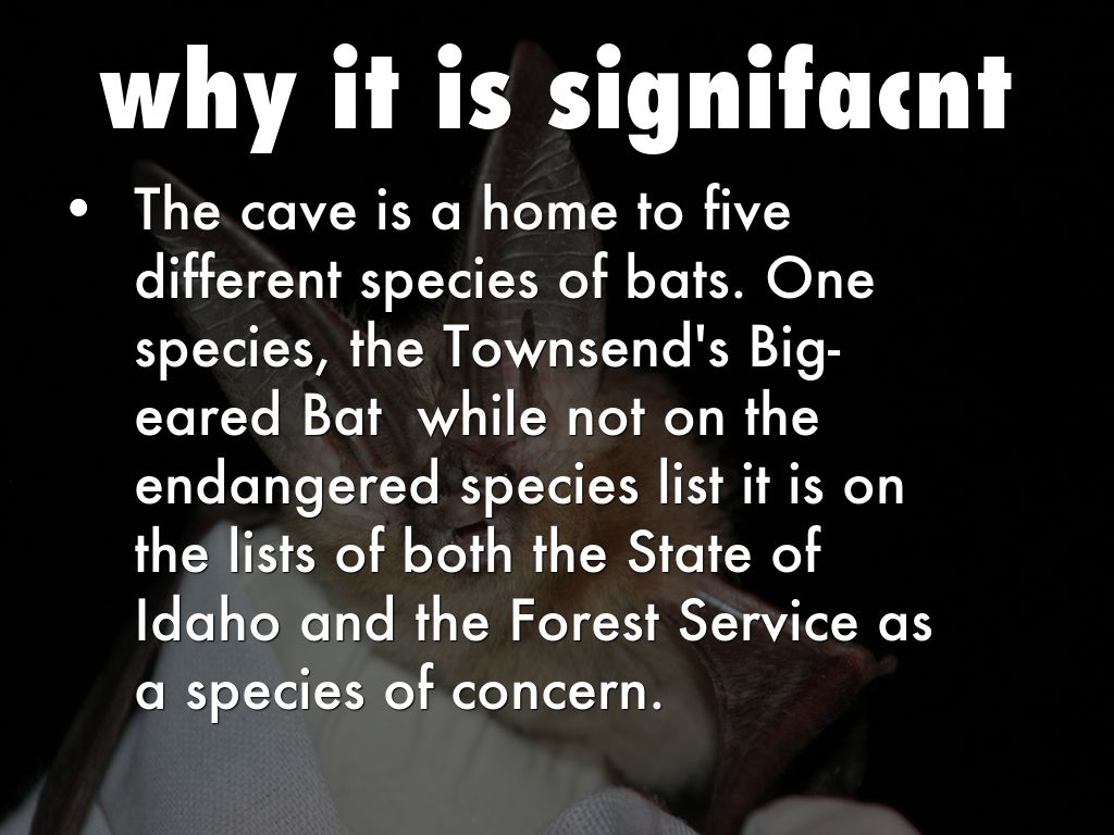 The cave is a home to five different species of bats. One species, the Townsend's Big-eared Bat while not on the endangered species list it is on the lists of both the State of Idaho and the Forest Service as a species of concern.