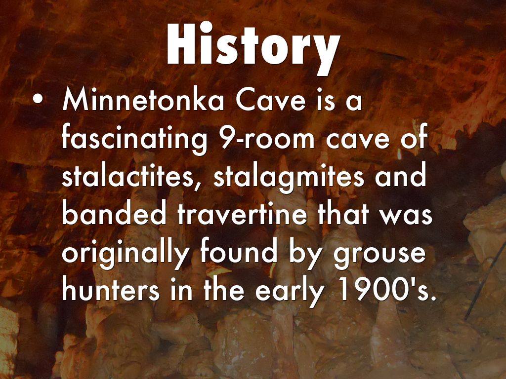 Minnetonka Cave is a fascinating 9-room cave of stalactites, stalagmites and banded travertine that was originally found by grouse hunters in the early 1900's.