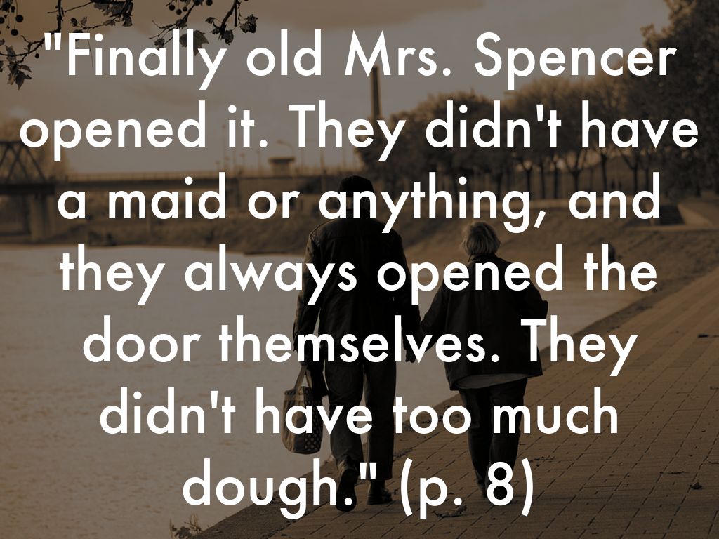 "Finally old Mrs. Spencer opened it. They didn't have a maid or anything, and they always opened the door themselves. They didn't have too much dough." (p. 8)