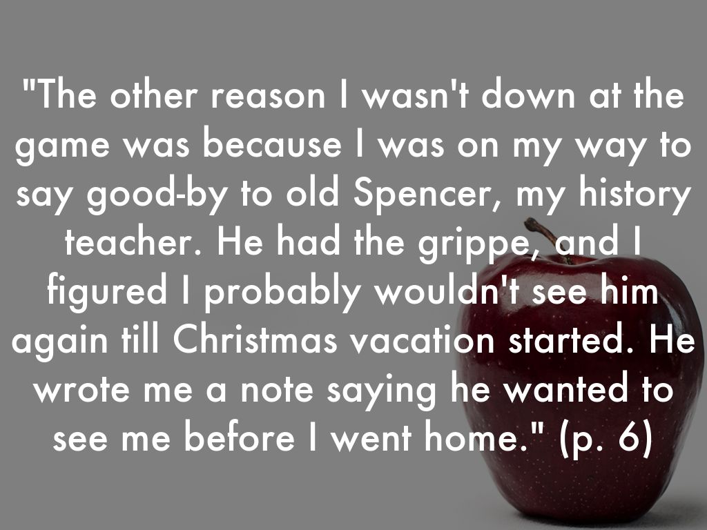 "The other reason I wasn't down at the game was because I was on my way to say good-by to old Spencer, my history teacher. He had the grippe, and I figured I probably wouldn't see him again till Christmas vacation started. He wrote me a note saying he wanted to see me before I went home." (p. 6)