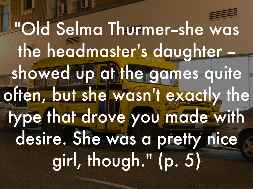 "Old Selma Thurmer--she was the headmaster's daughter --showed up at the games quite often, but she wasn't exactly the type that drove you made with desire. She was a pretty nice girl, though." (p. 5)