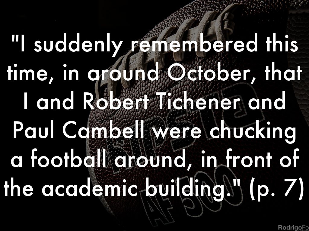"I suddenly remembered this time, in around October, that I and Robert Tichener and Paul Cambell were chucking a football around, in front of the academic building." (p. 7)