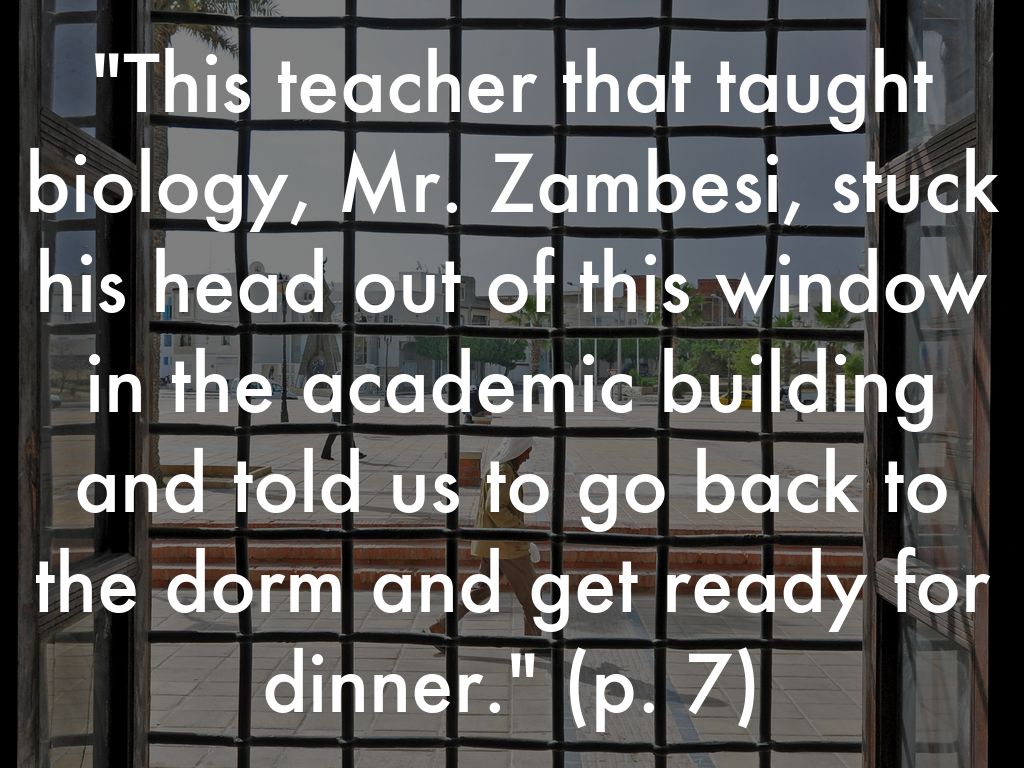 "This teacher that taught biology, Mr. Zambesi, stuck his head out of this window in the academic building and told us to go back to the dorm and get ready for dinner." (p. 7)