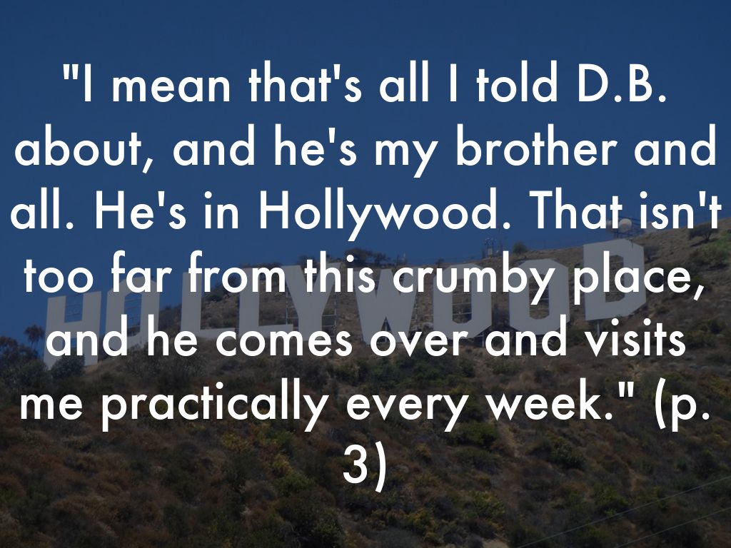 "I mean that's all I told D.B. about, and he's my brother and all. He's in Hollywood. That isn't too far from this crumby place, and he comes over and visits me practically every week." (p. 3)