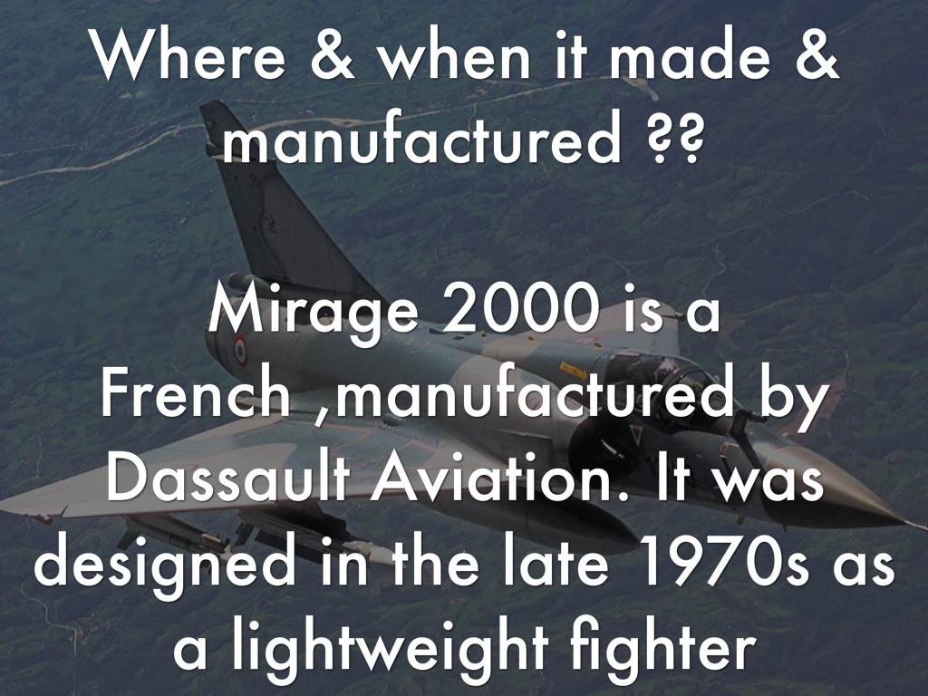 Mirage 2000 is a French ,manufactured by Dassault Aviation. It was designed in the late 1970s as a lightweight fighter