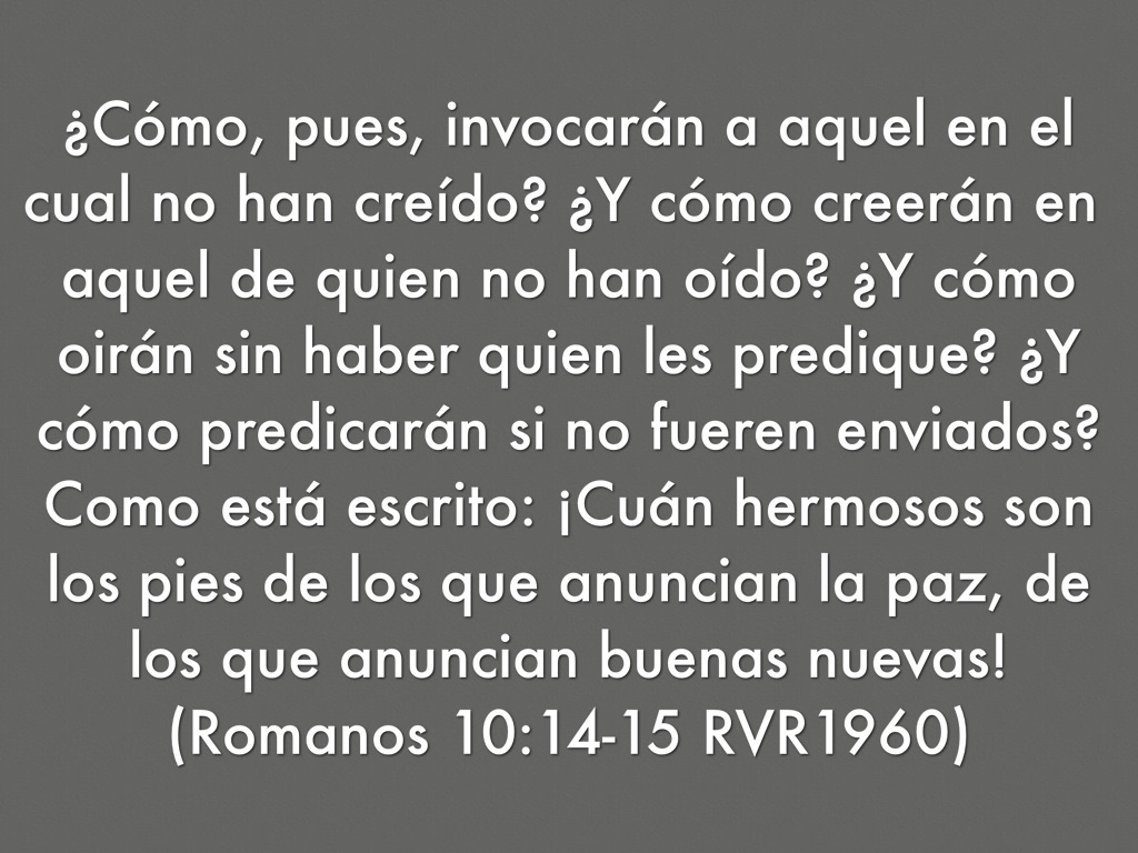 ¿Cómo, pues, invocarán a aquel en el cual no han creído? ¿Y cómo creerán en aquel de quien no han oído? ¿Y cómo oirán sin haber quien les predique? ¿Y cómo predicarán si no fueren enviados? Como está escrito: ¡Cuán hermosos son los pies de los que anuncian la paz, de los que anuncian buenas nuevas! (Romanos 10:14-15 RVR1960)
