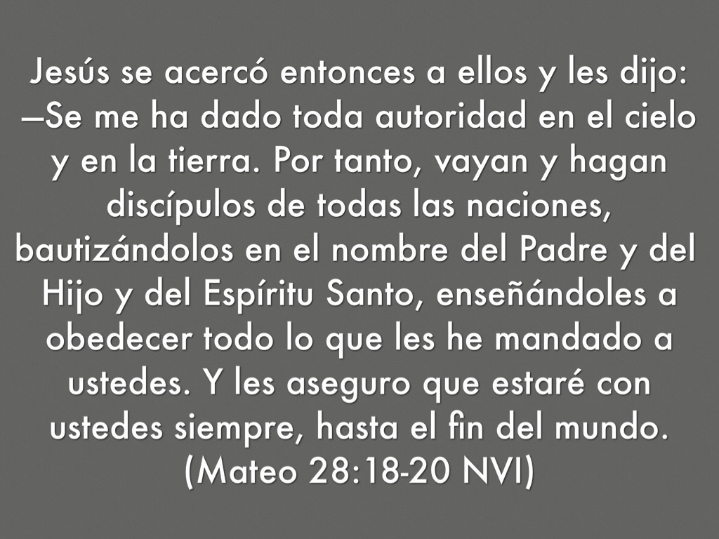 Jesús se acercó entonces a ellos y les dijo: —Se me ha dado toda autoridad en el cielo y en la tierra. Por tanto, vayan y hagan discípulos de todas las naciones, bautizándolos en el nombre del Padre y del Hijo y del Espíritu Santo, enseñándoles a obedecer todo lo que les he mandado a ustedes. Y les aseguro que estaré con ustedes siempre, hasta el fin del mundo. (Mateo 28:18-20 NVI)