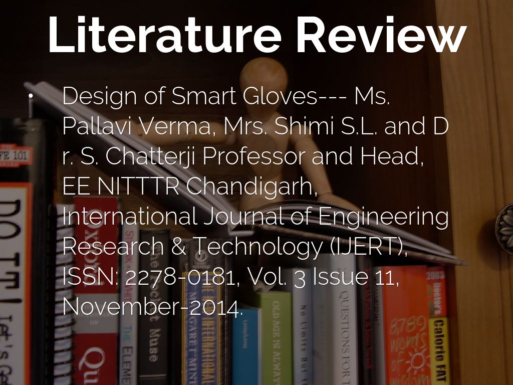 Design of Smart Gloves--- Ms. Pallavi Verma, Mrs. Shimi S.L. and D r. S. Chatterji Professor and Head, EE NITTTR Chandigarh, International Journal of Engineering Research & Technology (IJERT), ISSN: 2278-0181, Vol. 3 Issue 11, November-2014.