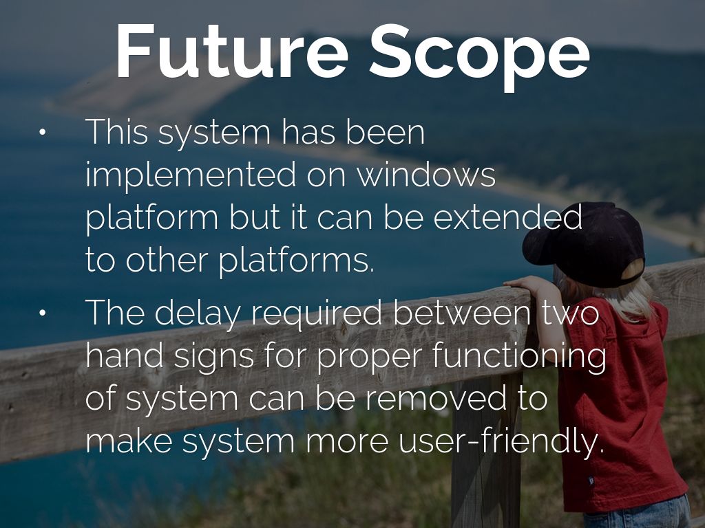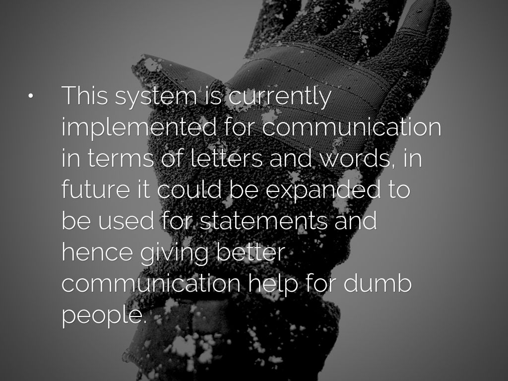 This system is currently implemented for communication in terms of letters and words, in future it could be expanded to be used for statements and hence giving better communication help for dumb people.