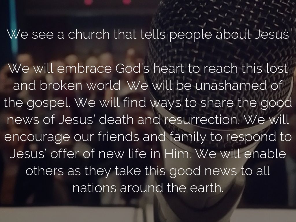 We will embrace God’s heart to reach this lost and broken world. We will be unashamed of the gospel. We will find ways to share the good news of Jesus’ death and resurrection. We will encourage our friends and family to respond to Jesus’ offer of new life in Him. We will enable others as they take this good news to all nations around the earth.