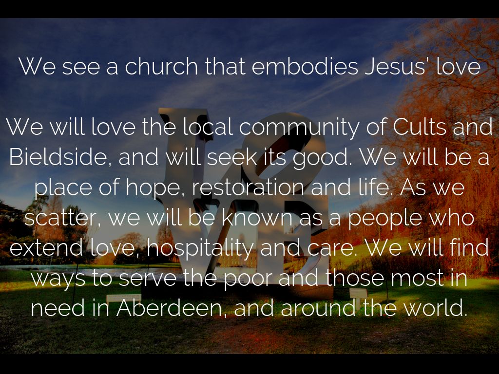 We will love the local community of Cults and Bieldside, and will seek its good. We will be a place of hope, restoration and life. As we scatter, we will be known as a people who extend love, hospitality and care. We will find ways to serve the poor and those most in need in Aberdeen, and around the world.