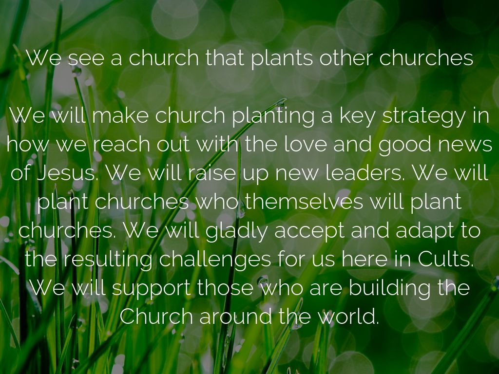 We will make church planting a key strategy in how we reach out with the love and good news of Jesus. We will raise up new leaders. We will plant churches who themselves will plant churches. We will gladly accept and adapt to the resulting challenges for us here in Cults. We will support those who are building the Church around the world.