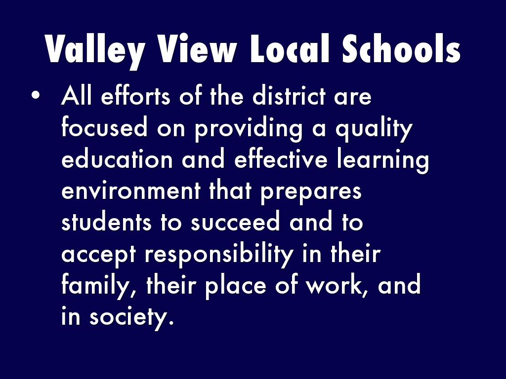 All efforts of the district are focused on providing a quality education and effective learning environment that prepares students to succeed and to accept responsibility in their family, their place of work, and in society.