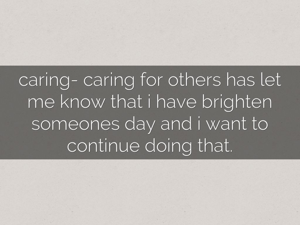 caring- caring for others has let me know that i have brighten someones day and i want to continue doing that.