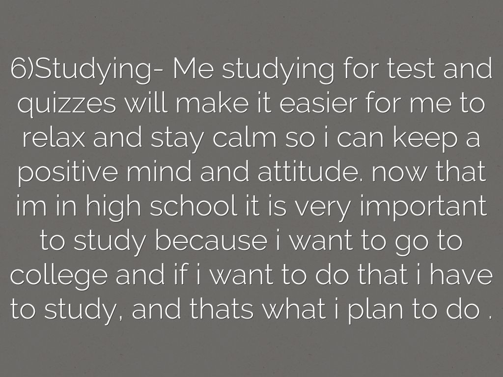 6)Studying- Me studying for test and quizzes will make it easier for me to relax and stay calm so i can keep a positive mind and attitude. now that im in high school it is very important to study because i want to go to college and if i want to do that i have to study, and thats what i plan to do .