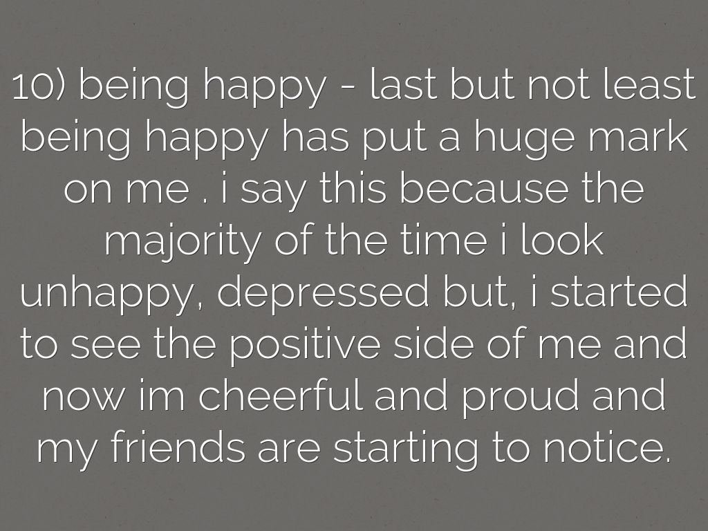 10) being happy - last but not least being happy has put a huge mark on me . i say this because the majority of the time i look unhappy, depressed but, i started to see the positive side of me and now im cheerful and proud and my friends are starting to notice.