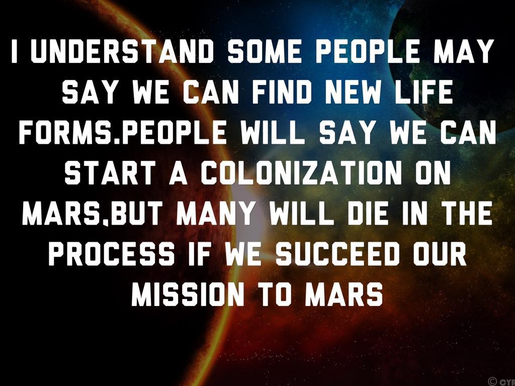 I understand some people may say we can find new life forms.People will say we can start a colonization on Mars,But many will die in the process if we succeed our mission to Mars