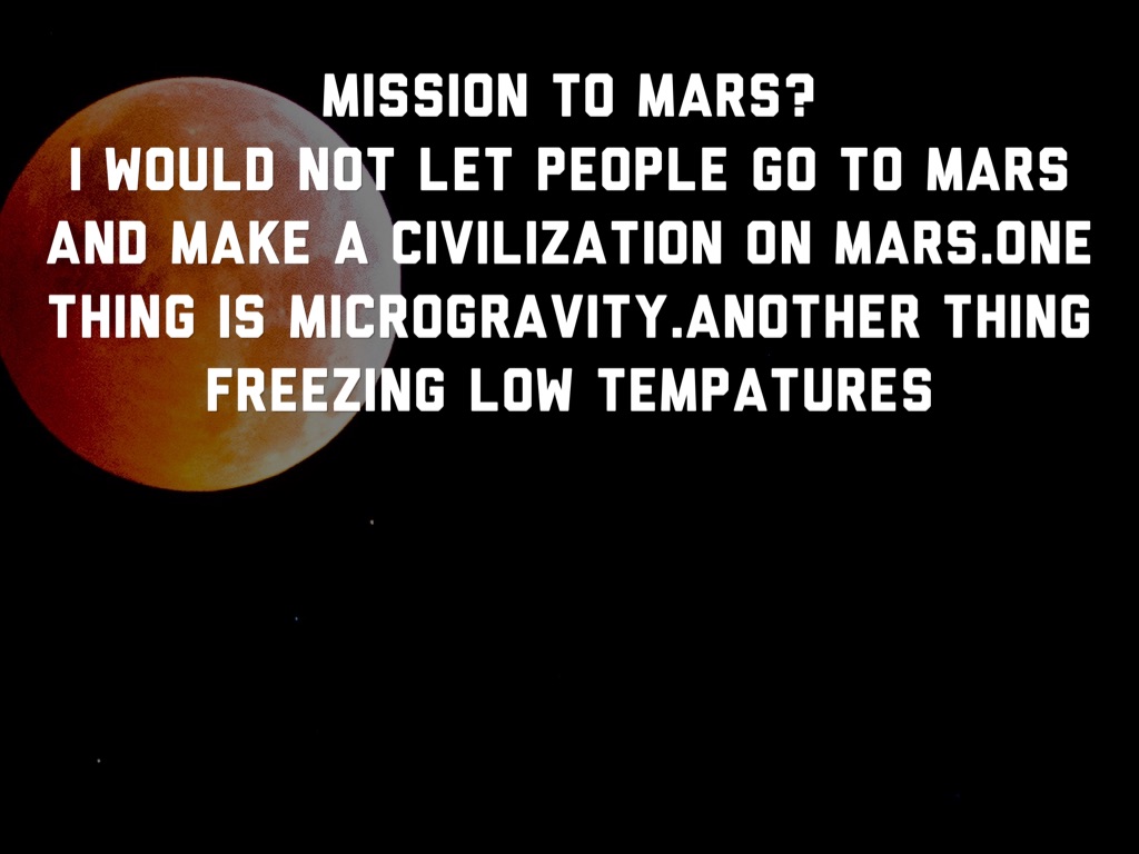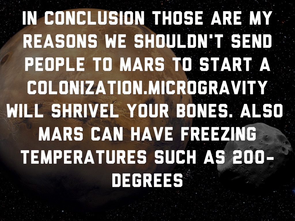 In conclusion those are my reasons we shouldn't send people to Mars to start a colonization.microgravity will shrivel your bones. Also Mars can have freezing temperatures such as 200- degrees