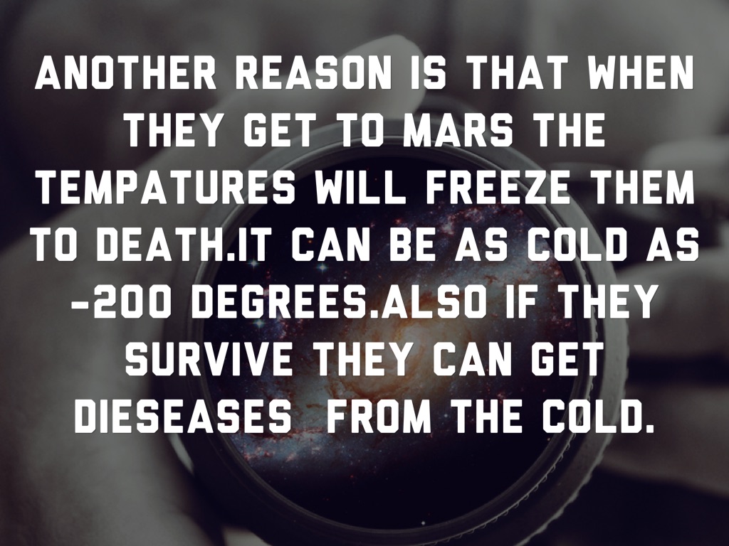 Another reason is that when they get to Mars the tempatures will freeze them to death.It can be as cold as -200 degrees.also if they survive they can get dieseases from the cold.