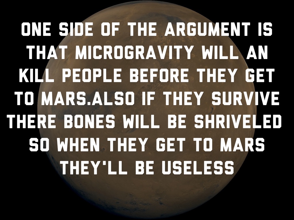 One side of the argument is that microgravity will an kill people before they get to Mars.Also if they survive there bones will be shriveled so when they get to Mars they'll be useless
