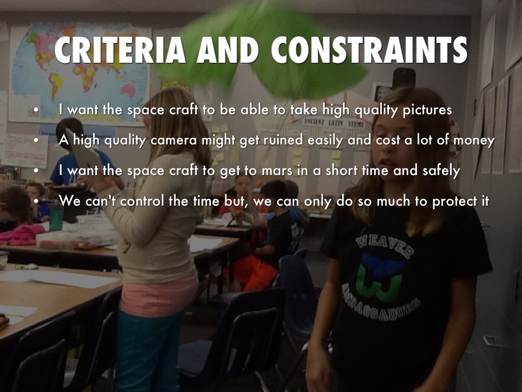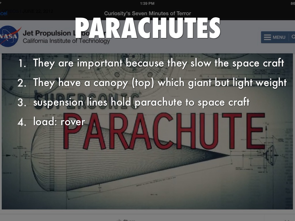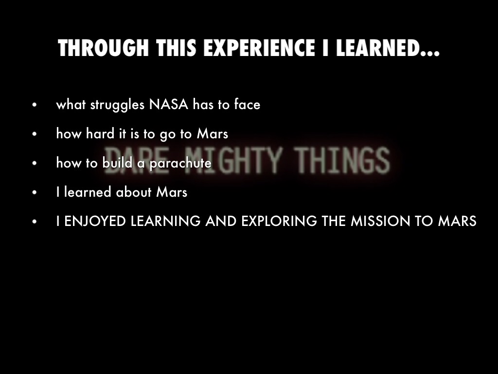 Through this process I learned how hard it is to go to mars and the struggles NASA has to go through. I learned how to create drag and what it's like to be an engineer. I loved making parachutes and learning about Mars.