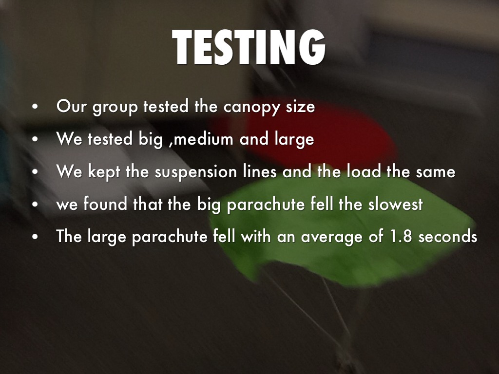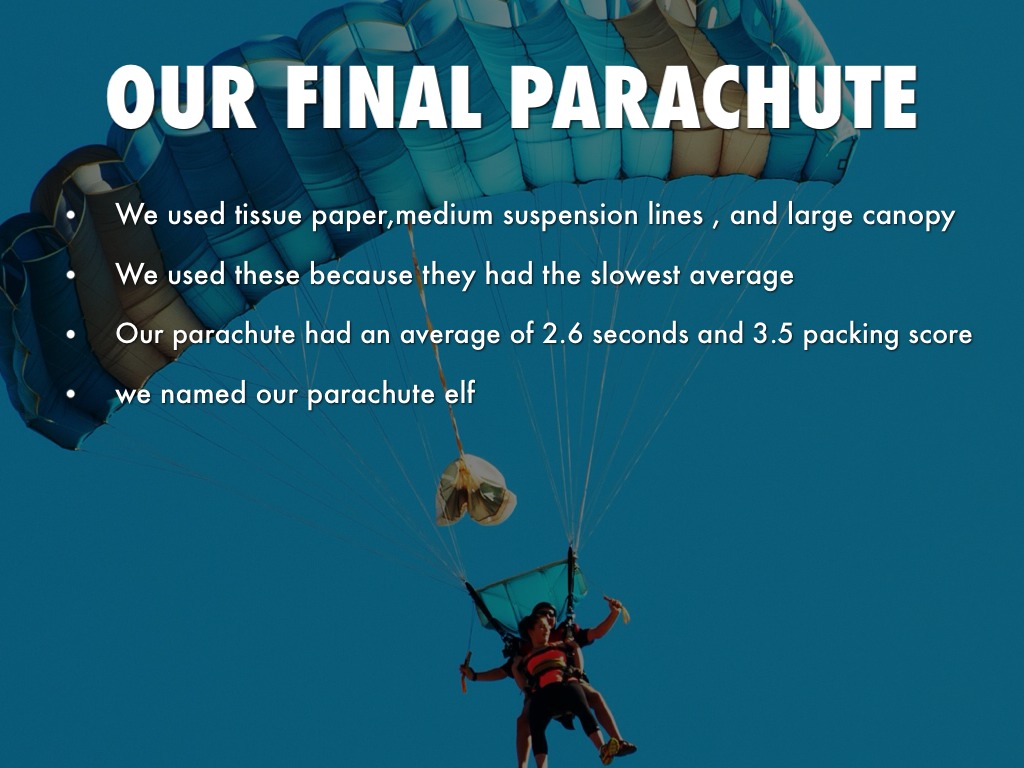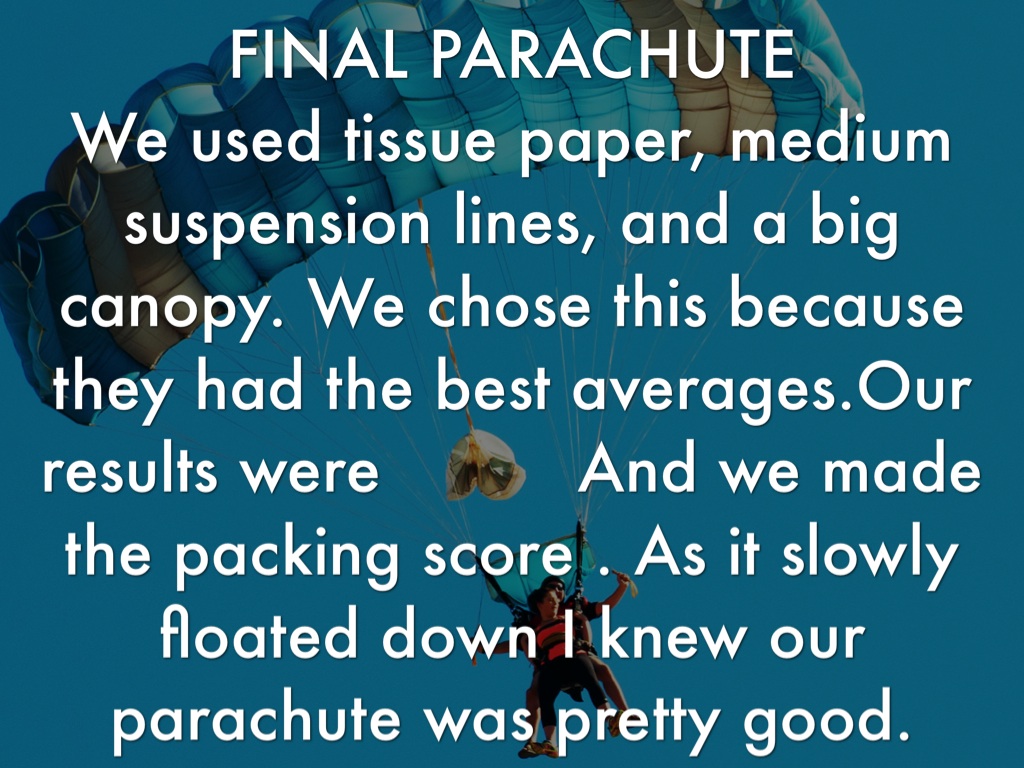 FINAL PARACHUTE We used tissue paper, medium suspension lines, and a big canopy. We chose this because they had the best averages.Our results were And we made the packing score . As it slowly floated down I knew our parachute was pretty good.