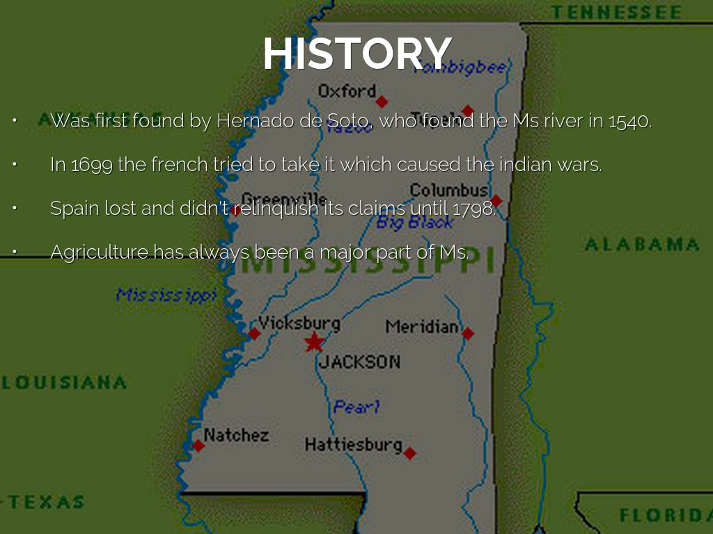 • Was first found by Hernado de Soto, who found the Ms river in 1540.