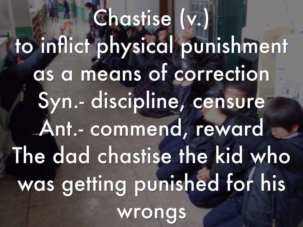 Chastise (v.) to inflict physical punishment as a means of correction Syn.- discipline, censure Ant.- commend, reward The dad chastise the kid who was getting punished for his wrongs
