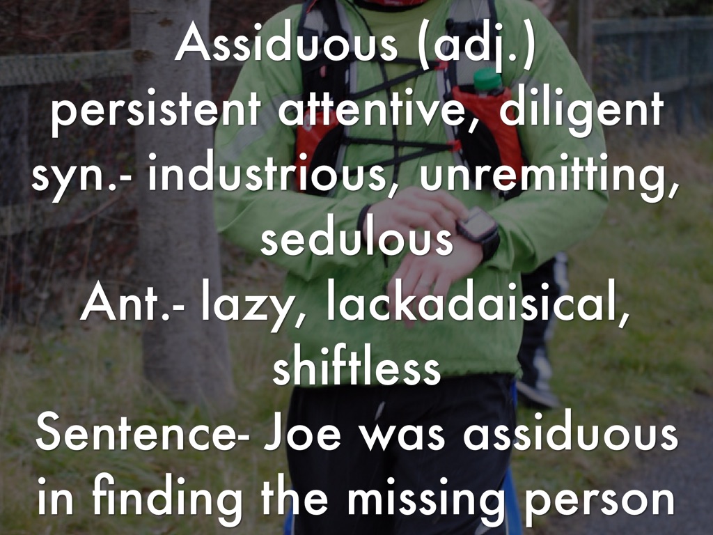 Assiduous (adj.) persistent attentive, diligent syn.- industrious, unremitting, sedulous Ant.- lazy, lackadaisical, shiftless Sentence- Joe was assiduous in finding the missing person