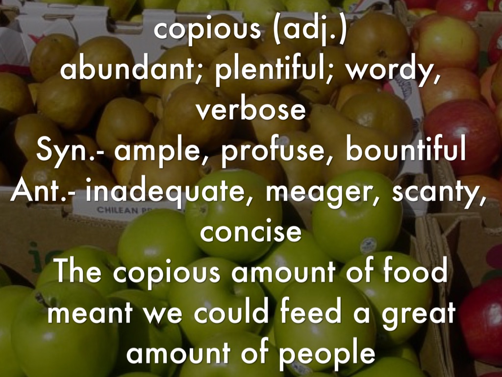 copious (adj.) abundant; plentiful; wordy, verbose Syn.- ample, profuse, bountiful Ant.- inadequate, meager, scanty, concise The copious amount of food meant we could feed a great amount of people