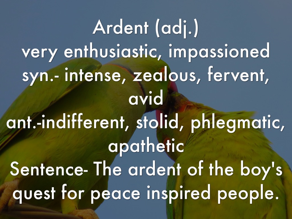 Ardent (adj.) very enthusiastic, impassioned syn.- intense, zealous, fervent, avid ant.-indifferent, stolid, phlegmatic, apathetic Sentence- The ardent of the boy's quest for peace inspired people.